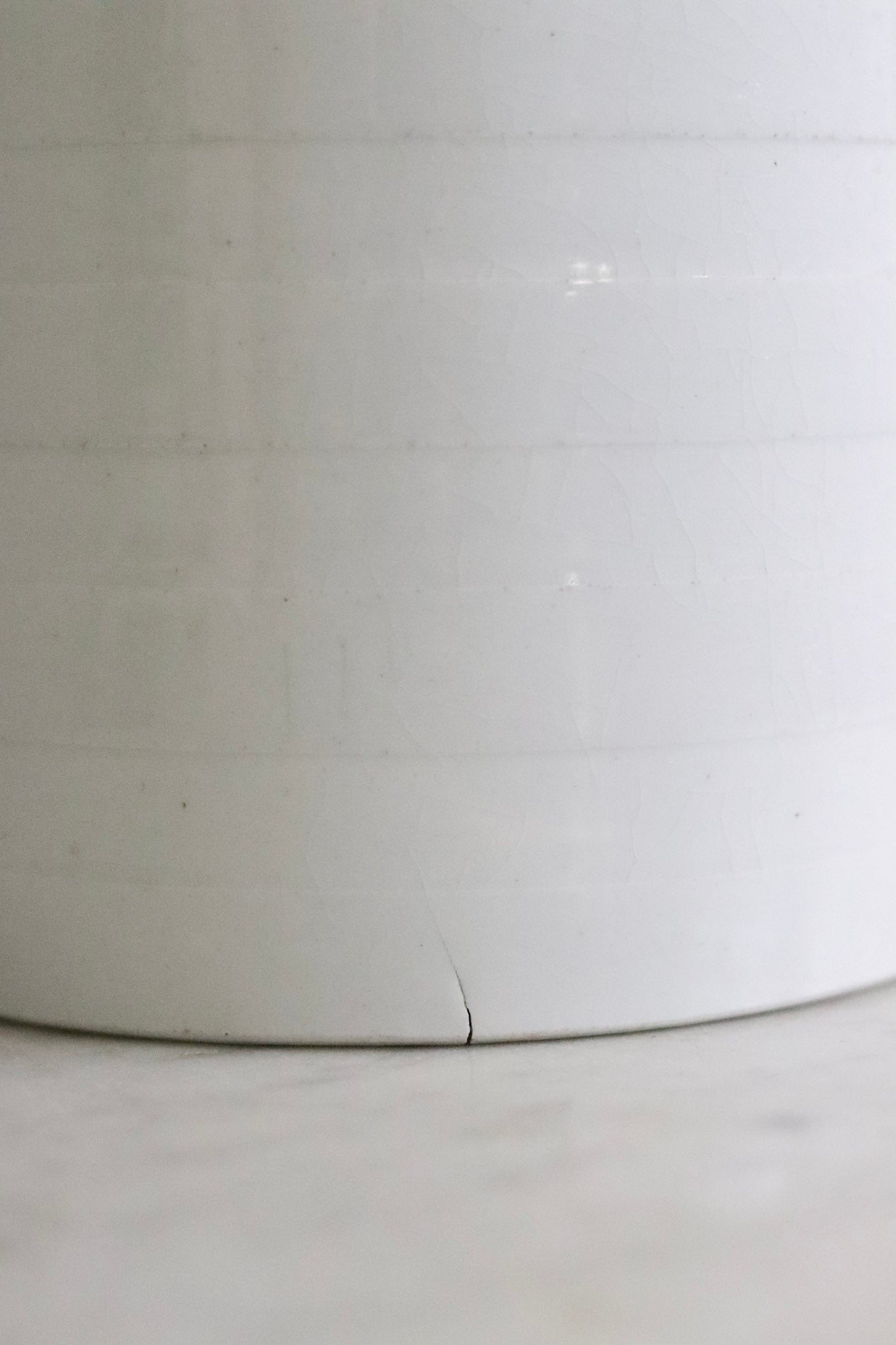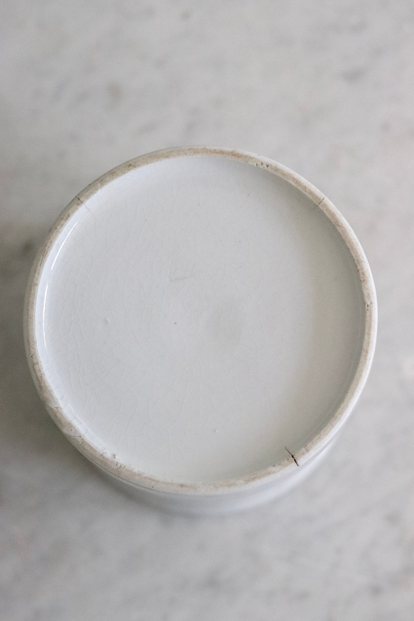 - Please see all photos for condition. No lid. Small stable cracks on the bottom, these do not go all the way through. Crazing and some discoloration on the front.