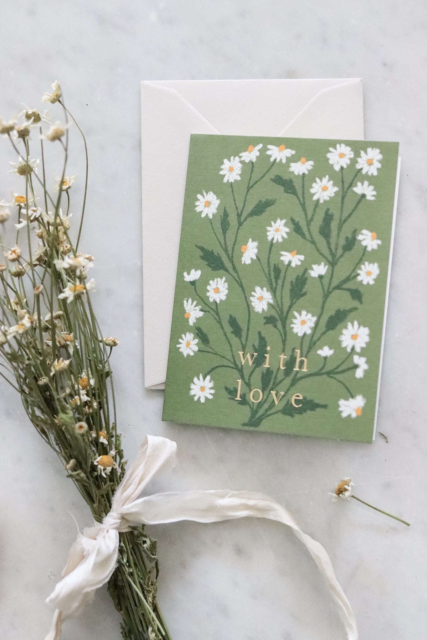 A sweet little card with an all over daisy print in shades of green, decorated with a gold foil 'with love' greeting. Paired with a recycled grey C7 envelope.