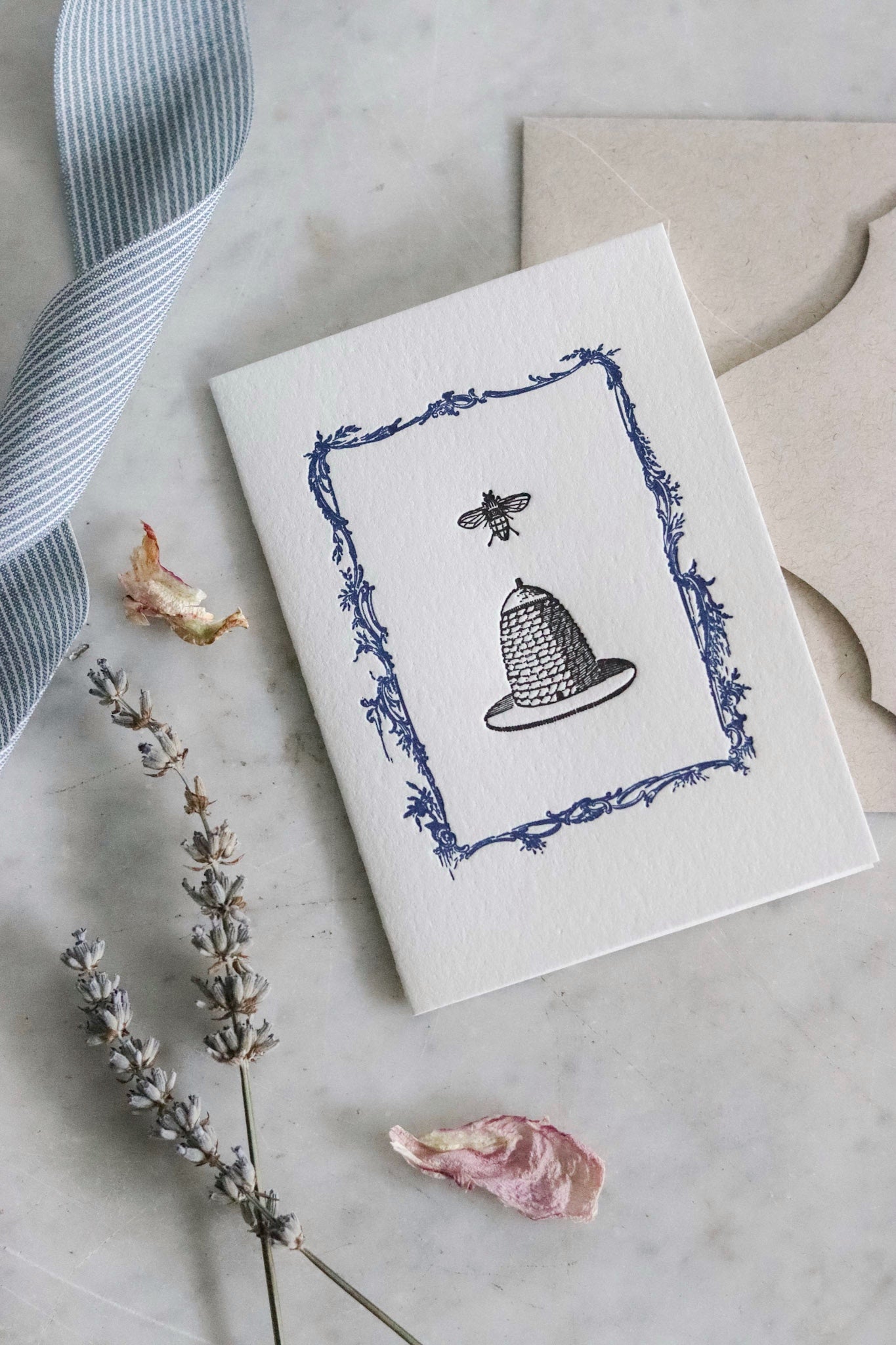 Single folded letterpress card printed in delft blue and black inks on tree free cotton paper.