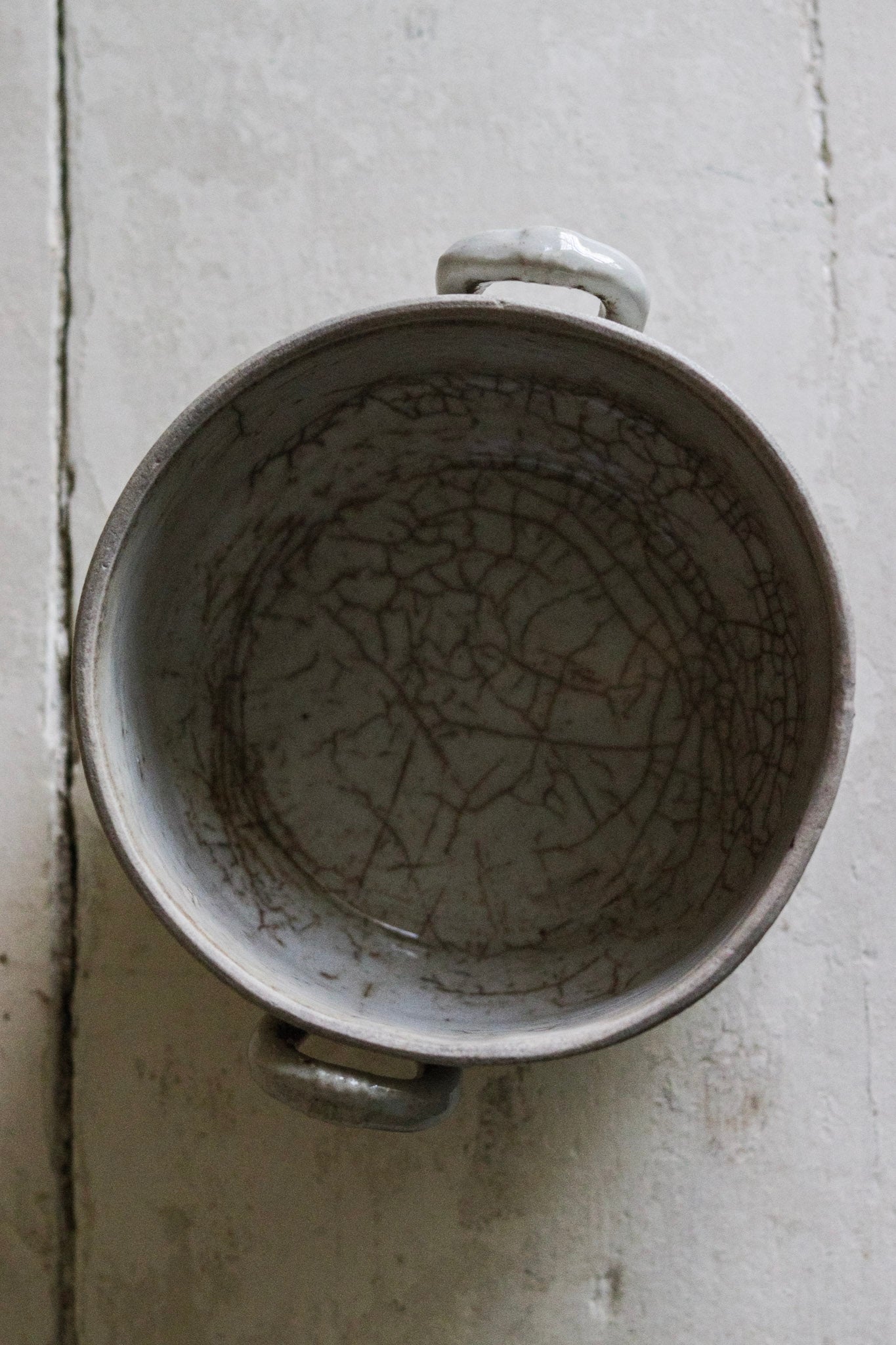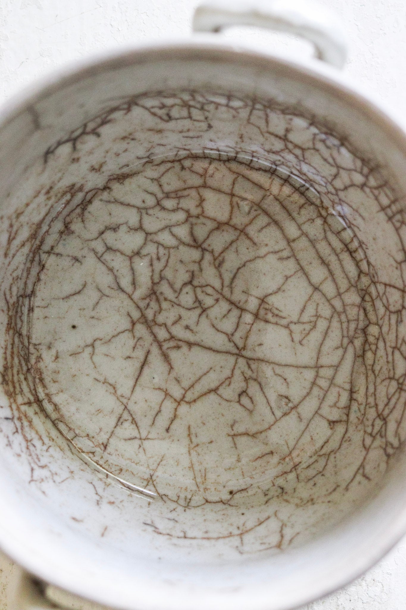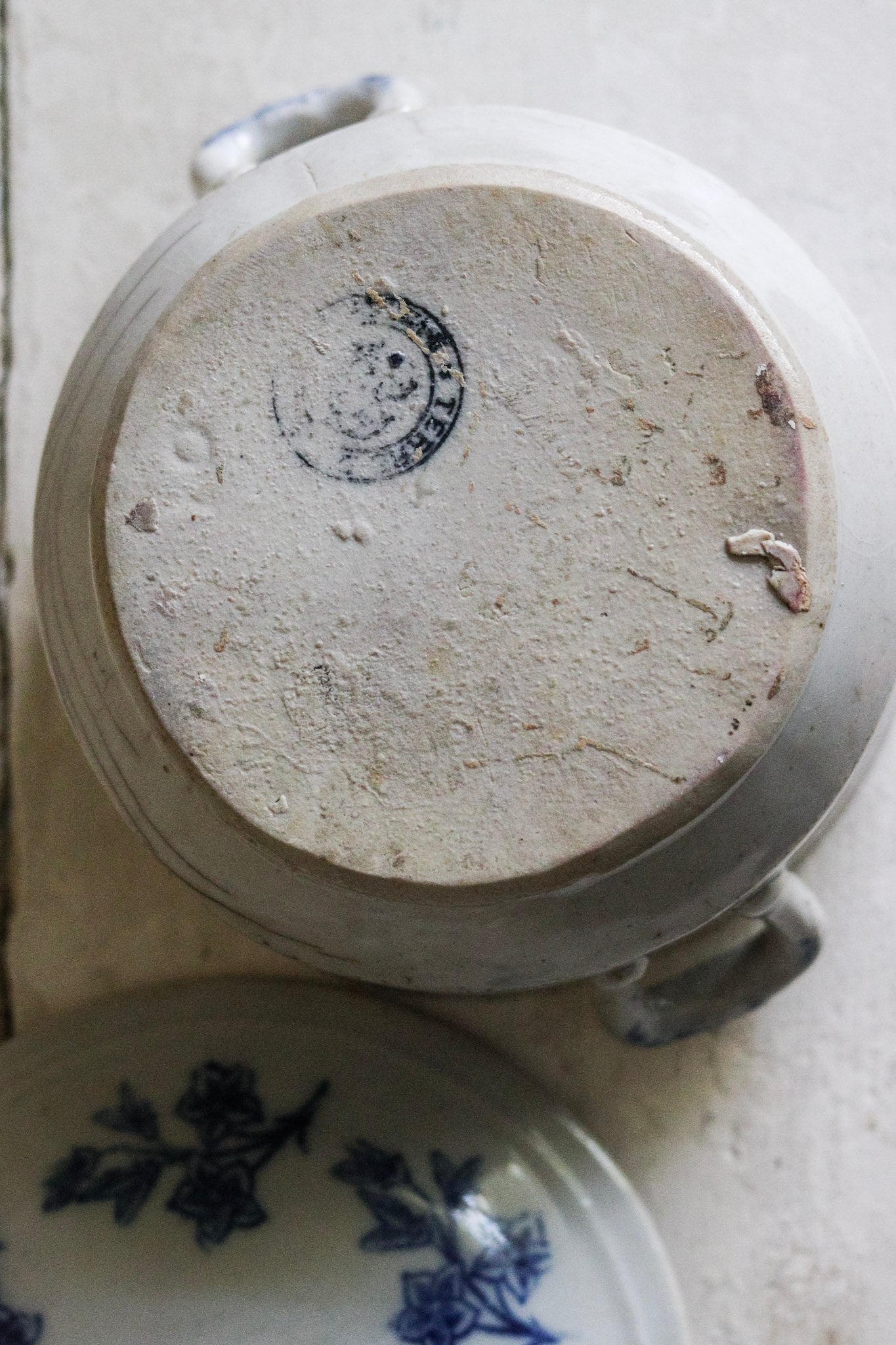 - Please see all photos for condition. Stable hairlines, defect on the rim from when it was made, staining as shown. Smooth chip on the underside of the lid.