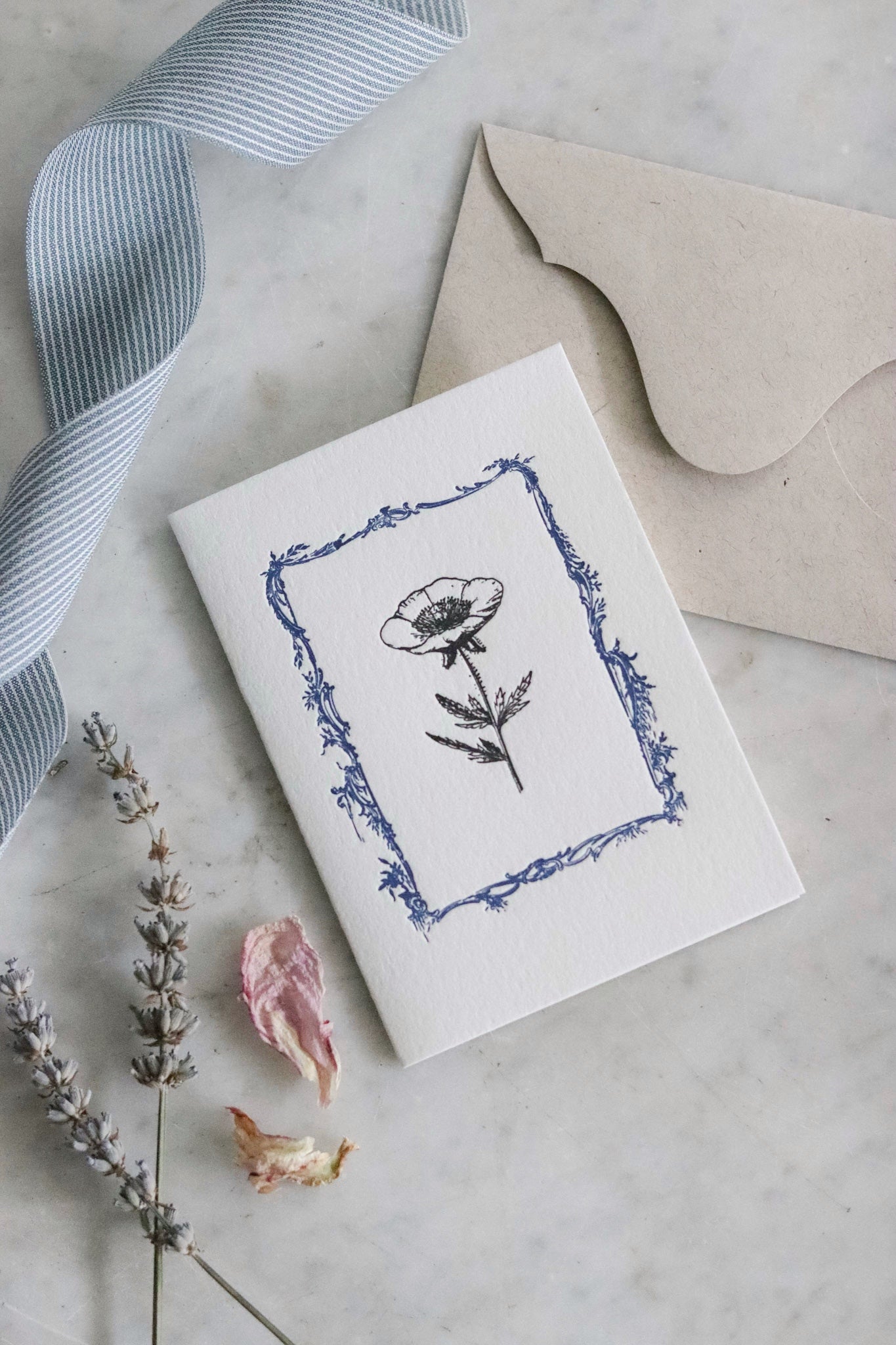Single folded letterpress card printed in delft blue and black inks on tree free cotton paper.