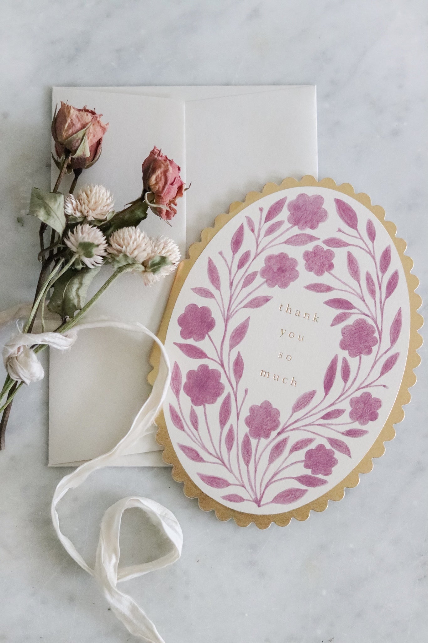 A beautiful oval card with golden scallop edging and a violet floral print. The floral design has a painterly quality as it's taken from an original gouache painting, and the gold foil text in the center of the card reads 'thank you so much. Paired with a pale grey envelope.